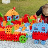 Częścią zabawy jest układanie klocków, co przyczynia się do rozwoju małej motoryki oraz koordynacji ręka-oko.