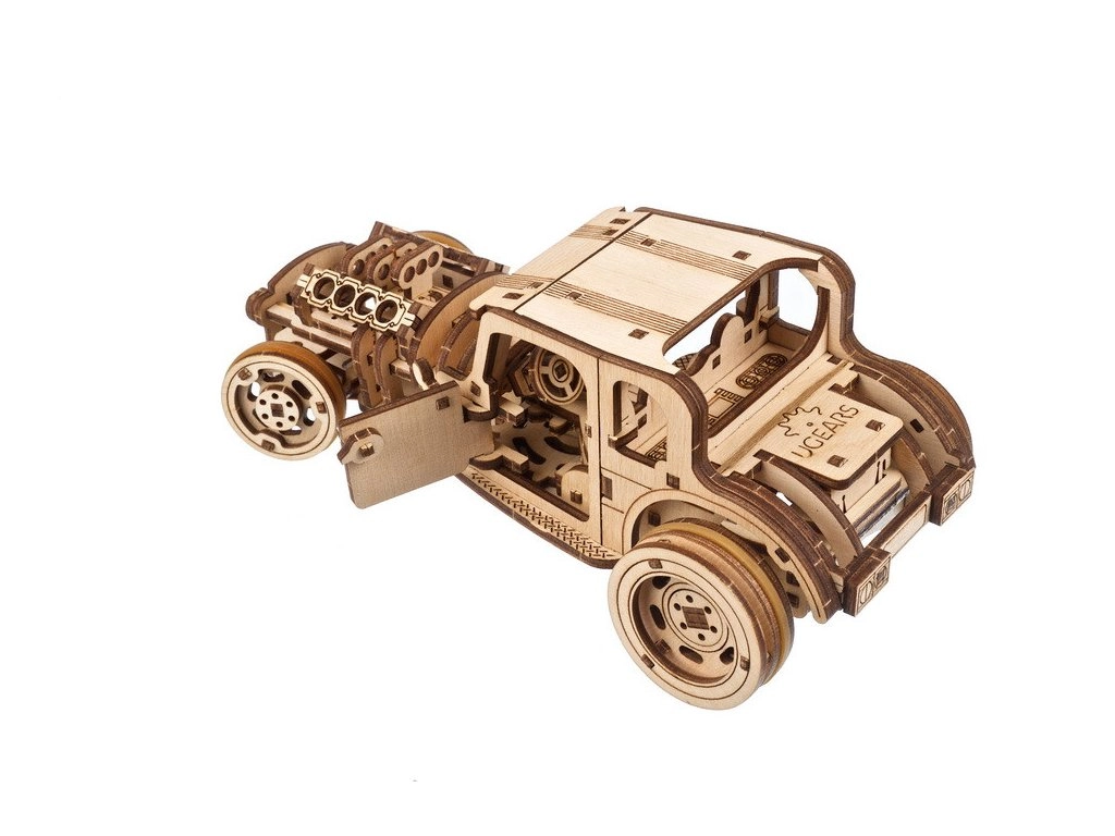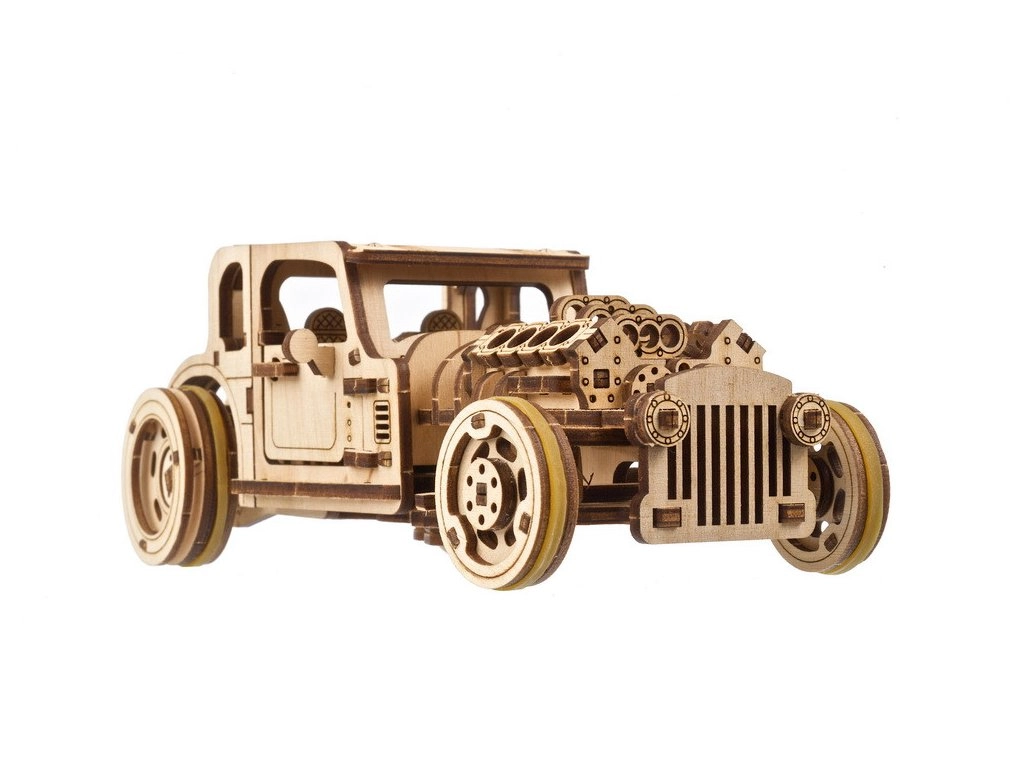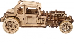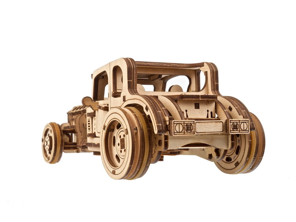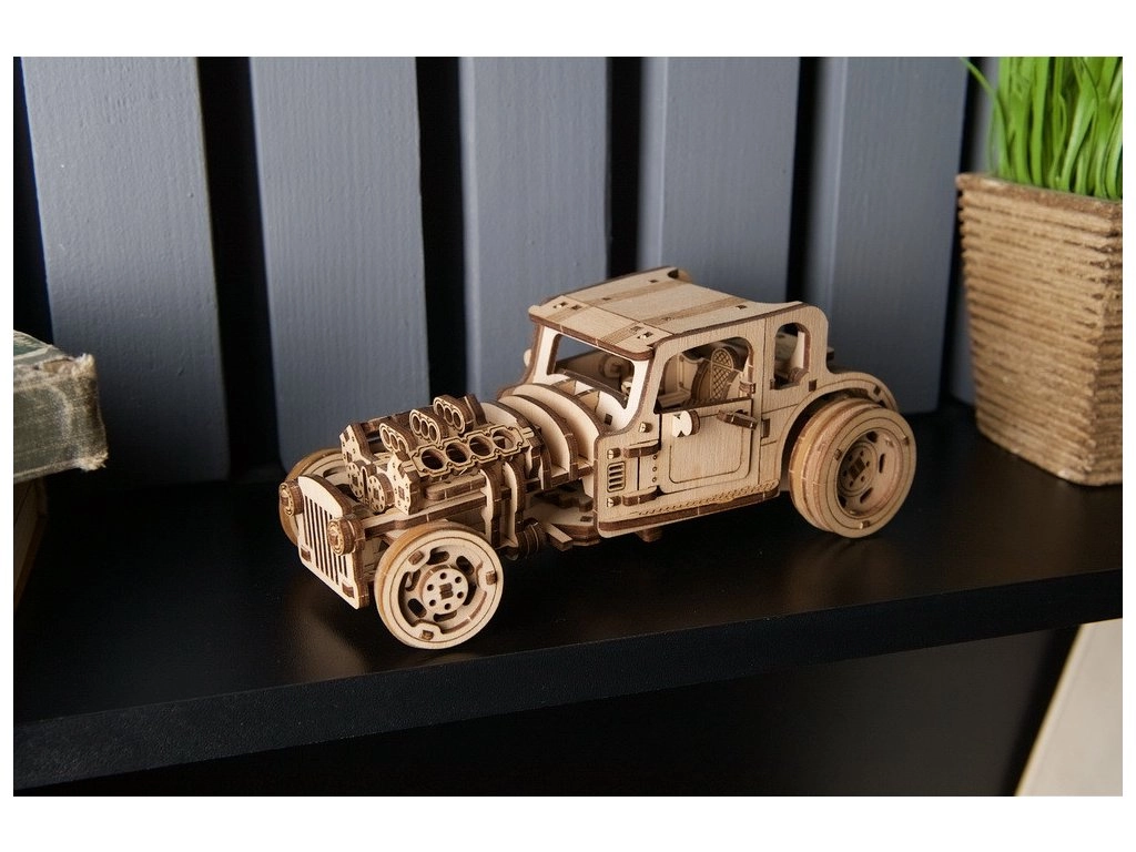 Model zaprojektowano tak, by bawił zarówno podczas składania, jak i jazdy. Po starannym „rozbieganiu” podwozia cieszysz się płynną pracą przekładni i dynamicznym startem. W naturalnym drewnie wygląda stylowo, ale możesz go śmiało pomalować według własnego gustu. Świetny prezent dla fanów hot rodów, mechaniki i designu.