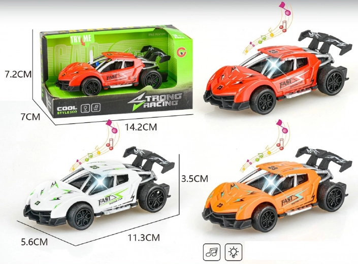 Kompaktowe autko wyścigowe na mechanizm napędu wstecznego ucieszy małych i dużych fanów szybkiej jazdy. Oferuje efekty świetlne i dźwiękowe aktywowane przyciskiem w kabinie, jest gotowe do jazdy łącznie z bateriami i dostępne w trzech wersjach kolorystycznych.