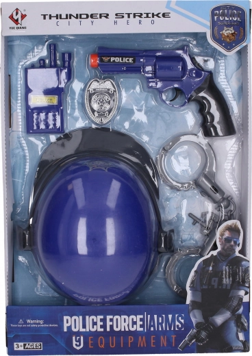 - Pistolet 20 cm (akustyczne efekty dźwiękowe), policyjna odznaka, krótkofalówka, kajdanki z kluczykiem, hełm