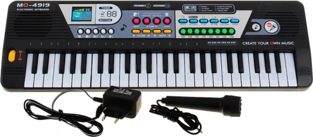 Nie zabrakło regulacji głośności i tempa, funkcji nagrywania i programowania, przycisku Stop oraz trybu S.E/Play. Dołączony mikrofon umożliwia śpiew i nagłośnienie, a wbudowany głośnik zapewnia wystarczająco donośny dźwięk. Dzięki zasilaniu przez adapter USB lub na 4× baterie AA możesz grać gdziekolwiek.