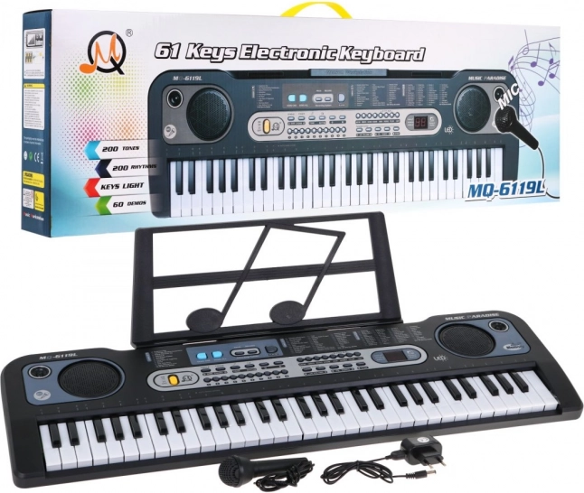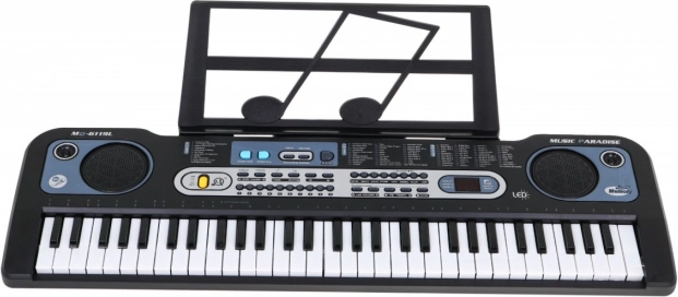 Keyboard oferuje bogate wyposażenie do kreatywnej gry: 200 rytmów, 200 brzmień, 60 podkładów demo, tryb perkusyjny oraz efekty vibrato i echo. Tryb nauki LESSON motywuje dzieci do regularnych ćwiczeń i radosnego odkrywania muzyki. Zasilanie możliwe jest z sieci (zasilacz w zestawie) lub za pomocą 6× AA.