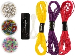 - Pełne wyposażenie: dzwoneczki, elastyczny sznurek, 3 kolorowe muliny, kółeczka łączące, 2 pojemniki z koralikami, igła, instrukcje