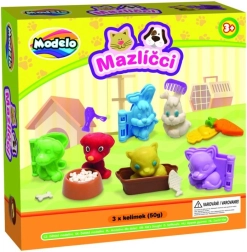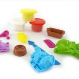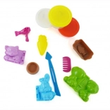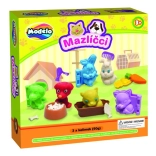 - 3 kubeczki plasteliny, 3 foremki na zwierzątka, miseczka, 2 foremki na jedzenie dla zwierzątek, grzebień, suszarka i nożyczki