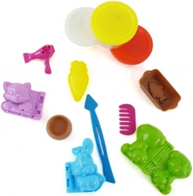 3 kubeczki plasteliny, 3 foremki na zwierzątka, miseczka, 2 foremki na jedzenie dla zwierzątek, grzebień, suszarka i nożyczki