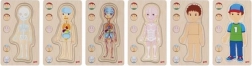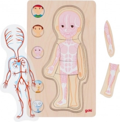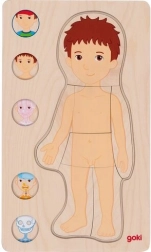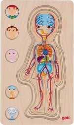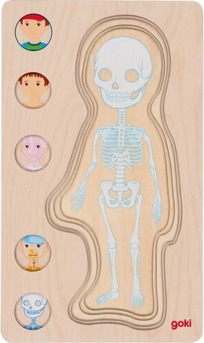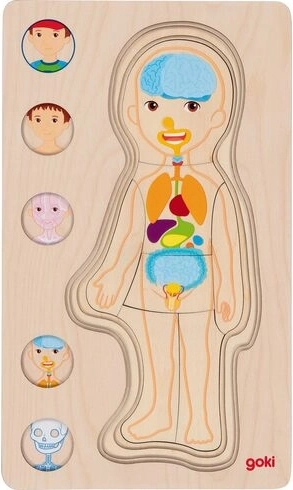 Drewniane puzzle „Ludzkie ciało – chłopiec” to idealna pomoc dla ciekawych świata dzieci, które chcą zajrzeć pod powierzchnię. Pięć warstw stopniowo pokazuje skórę, mięśnie, narządy wewnętrzne, układ krążenia i szkielet. Każde zdjęcie warstwy odsłania nową część ciała i pobudza naturalną chęć poznawania.