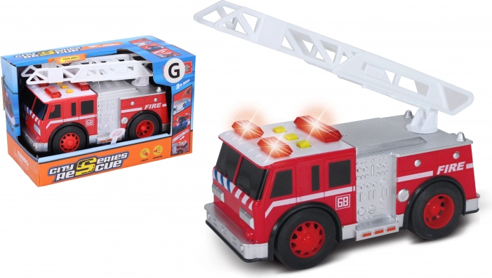Realistyczny wóz strażacki dla małych ratowników zapewnia mnóstwo zabawy dzięki efektom świetlnym i dźwiękowym, wysuwanemu drabinie oraz wolnym kołom dla płynnej jazdy. Kompaktowe wymiary 18×8×10 cm idealnie pasują do dziecięcych rąk.