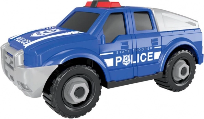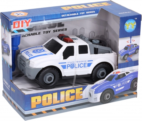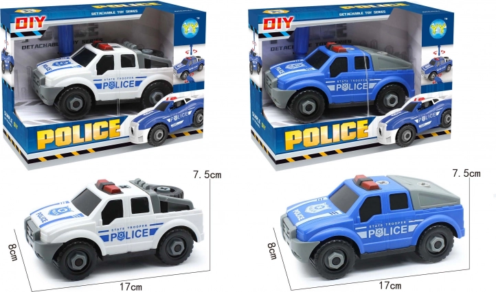 Zabawny model konstrukcyjny dla dzieci: policyjny pick-up do skręcania o długości 17 cm z swobodnie obracającymi się kołami. W zestawie znajduje się auto oraz śrubokręt krzyżakowy z praktycznym kluczem do nakrętek w rękojeści. Dostępne są 2 wersje kolorystyczne – biała i niebieska.