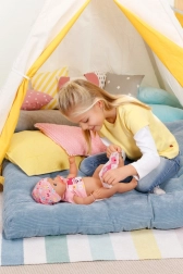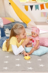 Lalka BABY born dziewczynka z magicznym smoczkiem to idealna towarzyszka do codziennej zabawy i nauki opieki nad niemowlęciem. Po przekręceniu smoczka oczy otwierają się lub zamykają nawet w pozycji siedzącej – niezależnie od ułożenia ciała. Po położeniu na plecach bez smoczka oczy automatycznie się zamykają. Miękkie ciałko Soft Touch oraz łatwo ruchome ręce, nogi i głowa ułatwiają przebieranie i dodają autentyczności.