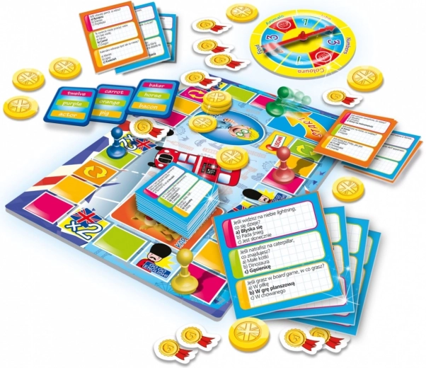 Gra rozwijająca słownictwo i znajomość języka angielskiego. W grze odpowiadasz na pytania i przesuwasz swój pionek po planszy, zdobywając przy tym specjalne odznaki. Quiz z pytaniami opiera się na programie szkoły podstawowej i jest podzielony na dwa poziomy trudności, dzięki czemu młodsze i starsze dzieci mogą spędzać czas przy planszy razem. W zestawie znajduje się instrukcja.