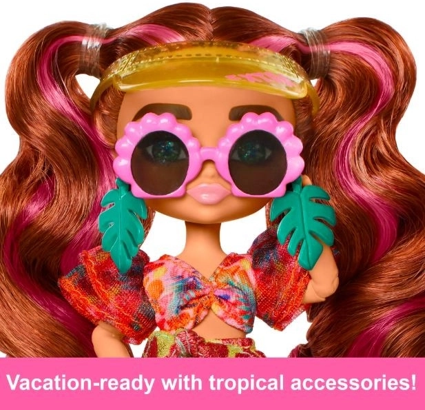 Mini lalka BARBIE Extra Fly Minis jest idealna dla dzieci, które kochają modę i wyobrażeniową zabawę. Jej tropikalny look obejmuje piękny strój kąpielowy, zielone sandałki i kolczyki w kształcie palm, które podkreślają letnią atmosferę. Dzięki kompaktowemu rozmiarowi świetnie sprawdzi się w podróży i łatwo mieści się w plecaczku.