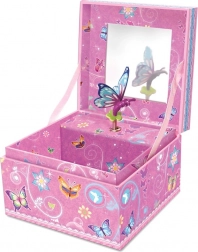 Przechowuj swoje skarby w uroczej szkatułce na biżuterię z motywem motyla. Po nakręceniu i otwarciu odgrywana jest delikatna melodia, która ucieszy każdą małą elegantkę. Szkatułka wykonana jest z mocnego i wytrzymałego papieru z gładkim wykończeniem, idealna do codziennego użytkowania. Świetny dodatek dla małych księżniczek i bezpieczne miejsce na pierwszą biżuterię oraz drobiazgi.