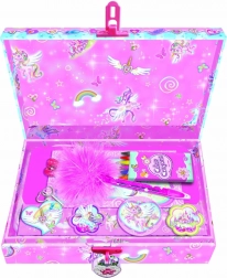 Ten czarujący zestaw łączy zabawę i porządek: dzieci schowają swoje sekrety w zamykanej szkatułce, a w zestawie listowym mogą pisać listy i wiadomości. Delikatny motyw jednorożców ucieszy wszystkich miłośników magicznych opowieści i pastelowych barw.
