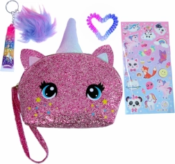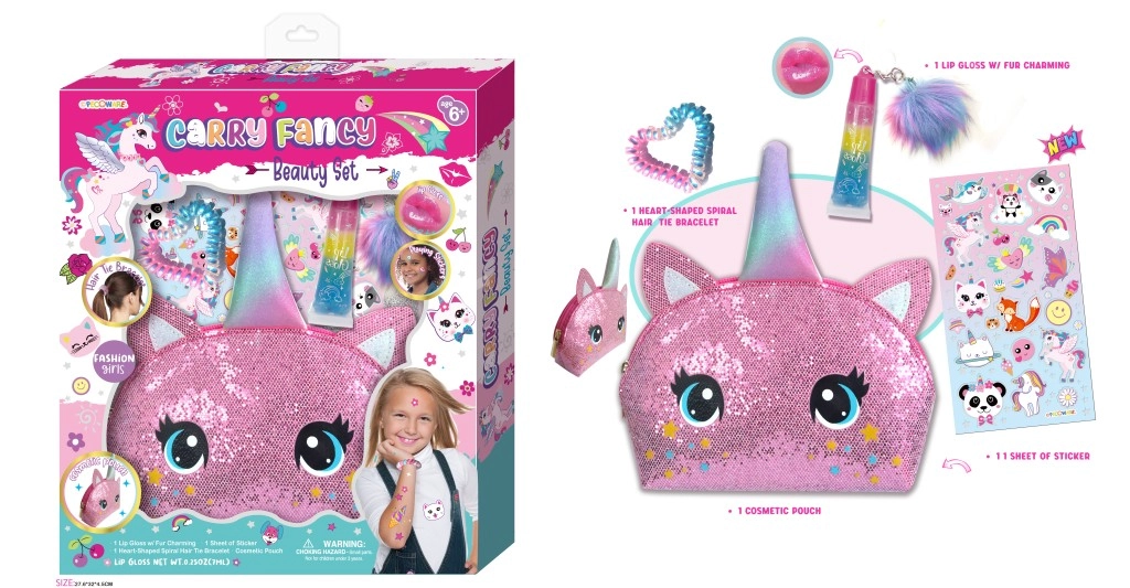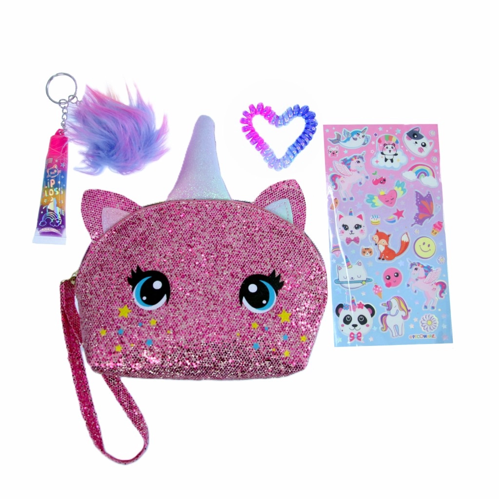 Piękny zestaw do makijażu idealny dla dzieci! Zawiera naklejki, błyszczyk do ust i kosmetyczkę. Gwarancja świetnej zabawy.