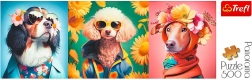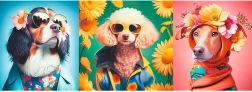 Trzy stylowo ubrane psy w okularach przeciwsłonecznych i z kwiatami na kolorowym tle tworzą figlarny obraz, który rozświetli każde wnętrze.