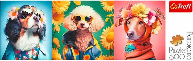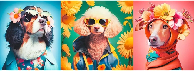 Odkryj figlarny świat psiego pokazu mody w żywych barwach i imponującym panoramicznym formacie. Stylowo ubrane pieski w okularach przeciwsłonecznych i z kwiatami zamienią układanie w świetną zabawę, a gotowy obraz stanie się oryginalną dekoracją.
