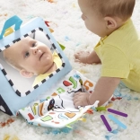 - Gra sensoryczna po każdej stronie: duże lusterko do odkrywania, szeleszczący panel, miękkie zawieszki i kontrastowe wzory