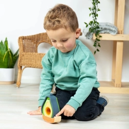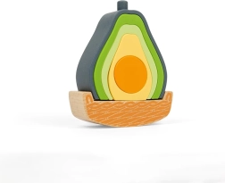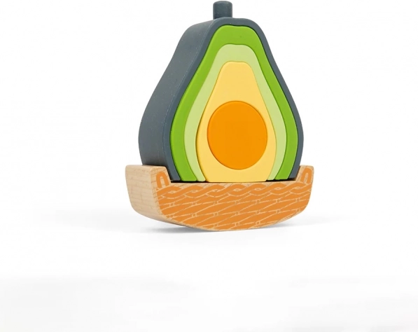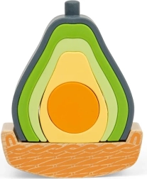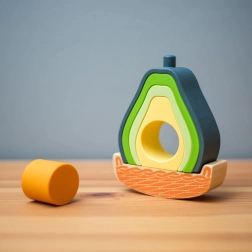 Zestaw w kształcie awokado łączy drewno z silikonem spożywczym, zapewniając bezpieczną i angażującą naukę. Dzieci mogą układać w stos, sortować elementy i sprawiać, że awokado będzie się kołysać na drewnianej podstawie. Pięć silikonowych części jest miękkich, wytrzymałych i świetnie sprawdza się jako zabawka sensoryczna. Materiały są nietoksyczne, silikon można myć w zmywarce, a drewniane elementy posiadają certyfikat FSC.