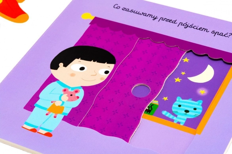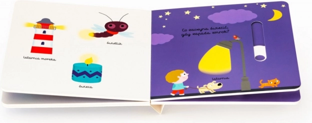 Dzięki książce z ruchomymi elementami „W nocy” dziecko pozna słowa związane z nocą. Dowie się, które zwierzęta są wtedy aktywne, co widać na niebie i co może być źródłem światła. Maluch znajdzie odpowiedzi na pytania, na przykład co porusza się po niebie albo co zaczyna świecić, gdy zapada zmrok.