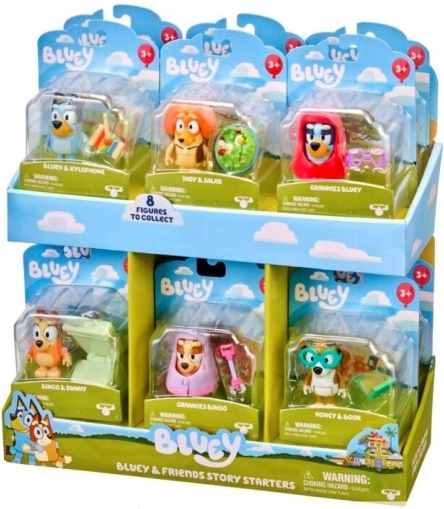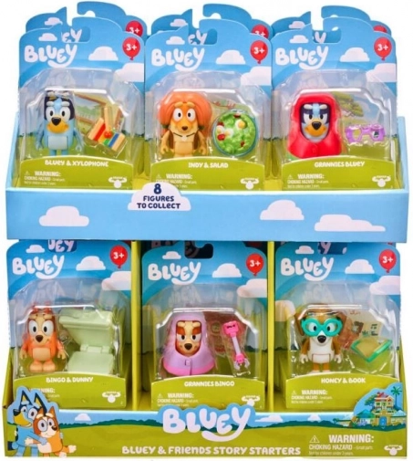 Zanurz się w świecie Bluey i dołącz do jej przygód z przyjaciółmi, takimi jak Bingo, Honey, Snickers, Indy i Muffin. Każdy zestaw „Start zabawy” tematycznie nawiązuje do odcinków serialu Bluey i zawiera akcesoria dla każdej postaci. W każdym opakowaniu znajduje się także urocza mini pocztówka z motywem z serialu.