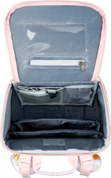 Nowy system odchylanego otwierania ułatwia dostęp do podręczników prosto z ławki. W środku znajdziesz przezroczystą kieszeń na plan lekcji i organizer z gumką, który pomaga równomiernie rozłożyć ciężar i bezpiecznie unieruchomić przybory.