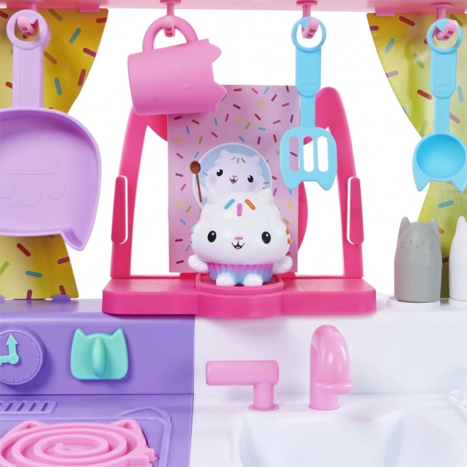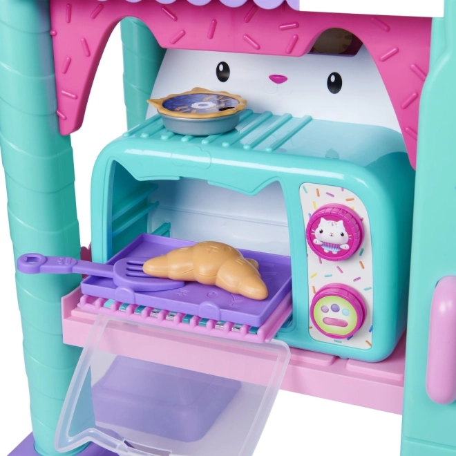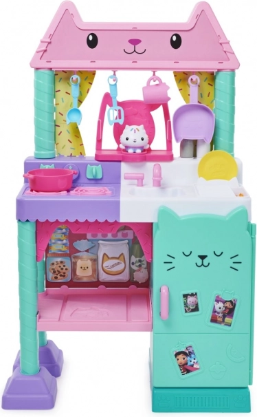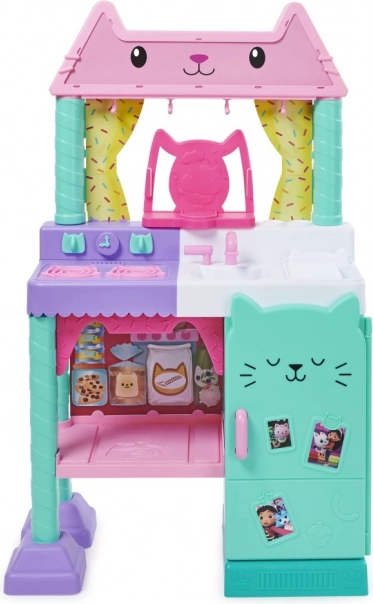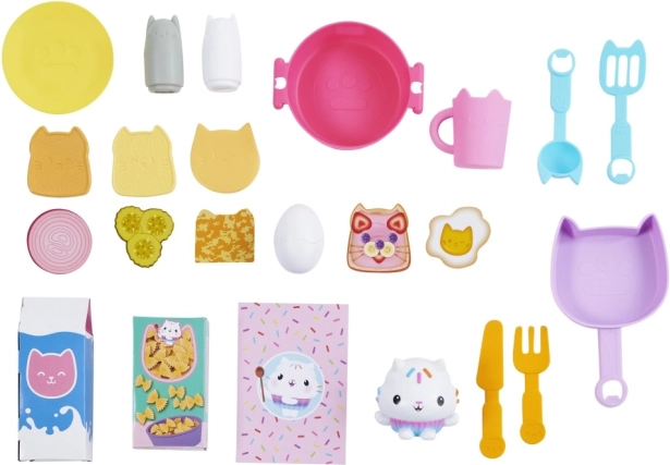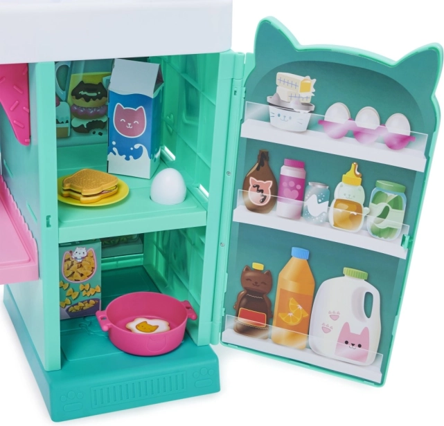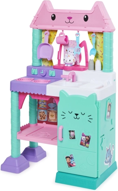 Przedstawiamy zestaw kuchenny Cakey Cat Kitchen dla dzieci ze świata Kociego Domku Gabi. Ta zabawkowa kuchnia to świetne uzupełnienie serii zabawek z Kociego Domku Gabi dla dziewczynek i chłopców, z ponad 20 akcesoriami kuchennymi i wysokością ponad 91 cm. Kuchnia Ciasteczkowego Kotka jest wyposażona w kuchenkę, zlew z ociekaczem, 10 kuchennych akcesoriów i naczyń, wieszaki nad oknem, 9 produktów spożywczych do zabawy oraz lodówkę ze zdjęciami Gabi i jej kotków, w której można przechowywać zabawkowe jedzenie, akcesoria i inne zabawki. Ta piękna kuchnia zawiera także dużą figurkę Ciasteczkowego Kotka ze specjalną podstawką, którą można przymocować do okna, aby Ciasteczkowy Kot mógł obserwować wasze kulinarne dzieła. Naciśnij przycisk na podstawce Ciasteczkowego Kotka i przekręć pokrętła kuchenki, aby aktywować ponad 20 dźwięków i kwestii, 9 efektów dźwiękowych gotowania, 3 utwory muzyczne i 11 tekstów Ciasteczkowego Kotka z ulubionego serialu Koci Domek Gabi na Netflixie. Jeśli chcesz jeszcze bardziej rozbudować małą kuchnię, pod kuchenką znajduje się półka zaprojektowana specjalnie dla piekarnika Bakey with Cakey Oven (sprzedawany oddzielnie). Zestaw kuchenny Ciasteczkowego Kotka to niezbędny dodatek dla wszystkich fanów Kociego Domku Gabi, którzy dzięki niemu mogą odgrywać sceny ze swoich ulubionych programów o gotowaniu lub tworzyć własne kulinarne dzieła dla rodziny i przyjaciół.