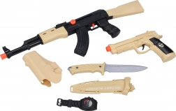 • Kompletny zestaw do zabaw tematycznych: karabin, pistolet z kaburą, nóż z pochwą, zegar na rękę.