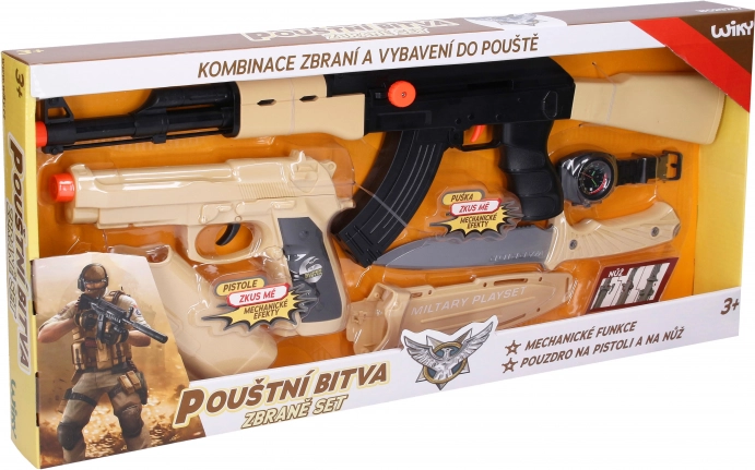 - Kompletny zestaw do zabaw tematycznych: karabin, pistolet z kaburą, nóż z pochwą, zegar na rękę.