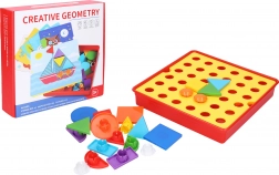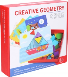 Kreatywna mozaika z figurami geometrycznymi dla dzieci wspiera małą motorykę, logiczne myślenie i kreatywność. Zestaw zawiera podstawkę 25 × 25 cm, 22 elementy oraz 12 szablonów ułatwiających układanie obrazków.
