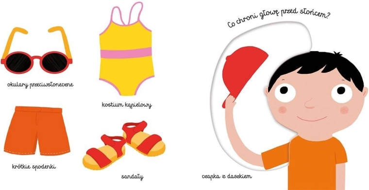 Książka z serii Pierwsze słowa Ubrania pokazuje małym czytelnikom różne rodzaje ubrań. Maluch dowie się, co może założyć, gdy pada deszcz, co nosi się w upalny letni dzień oraz przed snem.