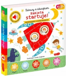 Akademia Mądrego Dziecka to znana i lubiana seria dla najmłodszych. Nowością w tej linii są dźwiękowe książeczki „Zabawa z dźwiękiem”, wśród których znajduje się tytuł „Rakieta startuje!”. Książka opowiada historię grupy astronautów, którzy wyruszają w kosmos. Na pierwszej stronie widzimy odliczanie z centrum kontroli lotu przed startem rakiety. Następnie śledzimy, jak astronauci lecą między planetami w kierunku Księżyca. Mijają spadające gwiazdy, a nawet statek z ufoludkami! Czy uda im się dolecieć na Księżyc? Koniecznie zajrzyj na kolejne strony! Nie zapomnij naciskać kolorowych przycisków na każdej stronie. Każdy z nich odtwarza odpowiedni dźwięk do ilustracji. Naciskając przyciski, nasz mały czytelnik ćwiczy paluszki oraz aparat mowy, naśladując usłyszane dźwięki. Dodatkowo, słuchając krótkiej opowieści, trenuje koncentrację.