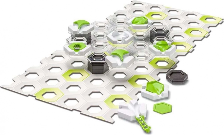 - Zawartość opakowania: 2 płyty bazowe, 1 przezroczysta płaszczyzna, 8 dużych elementów wysokościowych, 4 małe elementy wysokościowe, 2 zwrotnice, 1 element 3‑w‑1, 1 wir, 1 drabinka mety, 4 elementy podstawowe, nakładki: 2 łapacze, 1 swobodny spadek, 1 rozdzielacz potrójny, 1 cel, instrukcja.