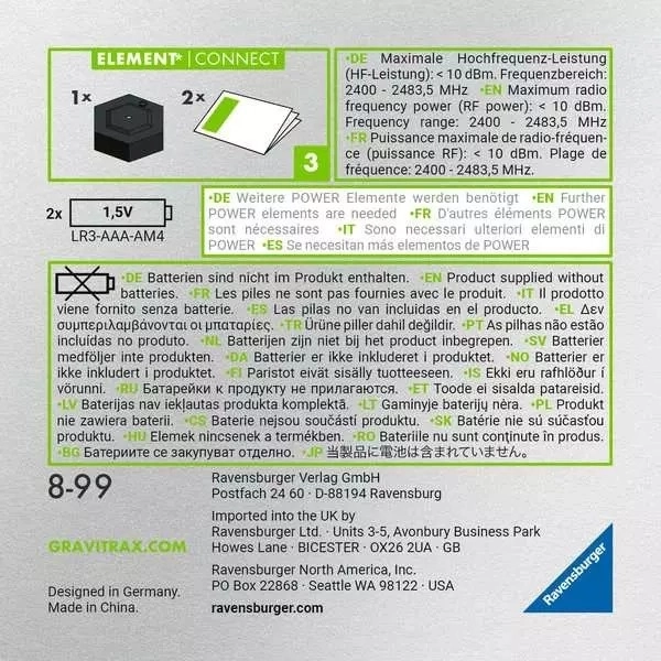 - Kompatybilność – działa z innymi elementami serii GraviTrax; do użycia wymagane są dodatkowe elementy Power.