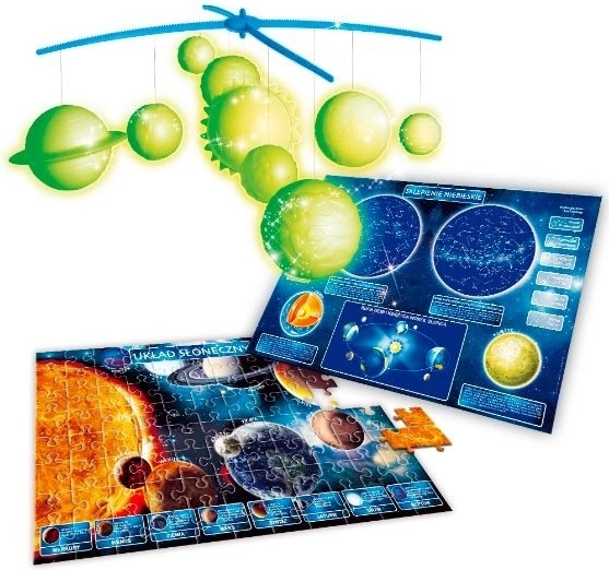 Zestaw do stworzenia prawdziwego modelu Układu Słonecznego! Opakowanie zawiera planety wykonane z fluorescencyjnego plastiku, dzięki czemu świecą w ciemności, ramię do zawieszania planet, duży plakat z gwiazdozbiorami, puzzle Układu Słonecznego oraz instrukcję.