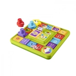Przedstawiamy interaktywną grę Fisher-Price Ucz się i śmiej! Pierwsza gra 123, która łączy zabawę z nauką. Ta zabawka w formie gry planszowej zawiera trzy aktywne punkty, które uruchamiają efekty świetlne i dźwiękowe, piosenki oraz frazy edukacyjne.