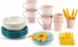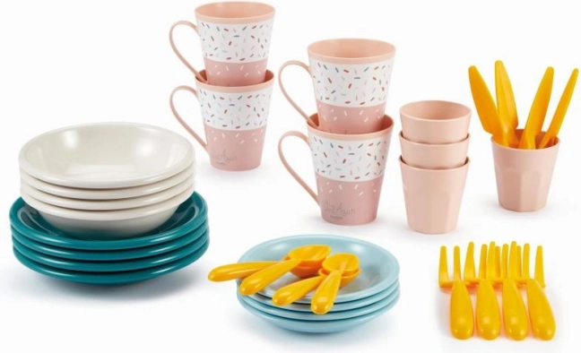 Ten plastikowy zestaw naczyń jest idealny dla wszystkich, którzy chcą zorganizować nieformalny piknik lub popołudnie w ogrodzie. 32 elementy tego zestawu obejmują talerze, talerzyki deserowe, miski, kubki, kubeczki i sztućce, wszystko z lekkiego i trwałego plastiku. Praktyczne pudełko ułatwia przenoszenie i dzieci mogą bezpiecznie uczestniczyć w przygotowywaniu jedzenia. Pudełko jednocześnie służy jako stolik serwujący.