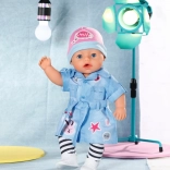 Stylowa koszulowa sukienka dla lalki BABY born w rozmiarze 43 cm łączy swobodny dżinsowy look z eleganckimi detalami. Zestaw zawiera sukienkę z paskiem, prążkowane legginsy, różową czapeczkę i białe tenisówki. Idealny do kreatywnej zabawy i przebierania, z naciskiem na wysoką jakość wykonania, wygodne ubieranie i bogate akcesoria.