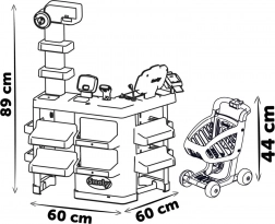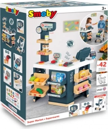 Supermarket z kasą, działem owoce/warzywa, wagą (nowa waga mechaniczna: wyświetlana masa dostosowuje się do ważonych produktów). Dziecko może ustawiać zegar oraz tabliczkę otwarte/zamknięte. Zawiera 42 akcesoria: makaron, ciastka, płatki śniadaniowe, mleko, 6 sztuk owoców i warzyw, 1 ciasto, 2 makaroniki, 2 puszki, 1 elektroniczny skaner kodów kreskowych z dźwiękiem i światłem, 1 karta kredytowa, 4 paragony, 9 monet i 12 banknotów. Kasa ma szufladę na pieniądze, mikrofon i czytnik kart kredytowych. Wózek w zestawie.