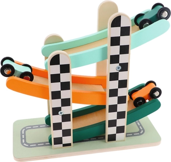 Kaskadowy tor wyścigowy dla samochodzików z 4 pojazdami, drewno i plastik, 33 × 32 × 10 cm