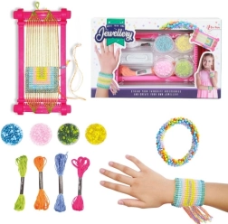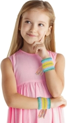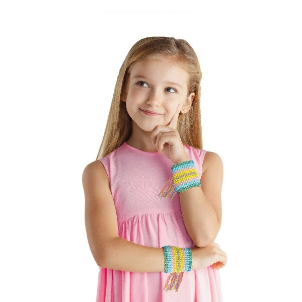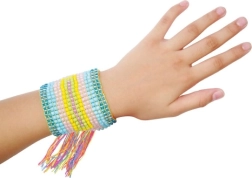 Upleć własną bransoletkę, która będzie pasować do Twojej stylizacji. Świetna zabawa na wolne chwile. Stwórz naprawdę oryginalną biżuterię, jakiej nikt inny nie będzie mieć! Zestaw zawiera 4 kolorowe nici bawełniane, 4 kolory koralików oraz krosno do plecenia.