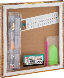 - Długopis aplikacyjny, miseczka, wosk, zestaw kolorowych kryształków, płótno z nadrukiem na ramie