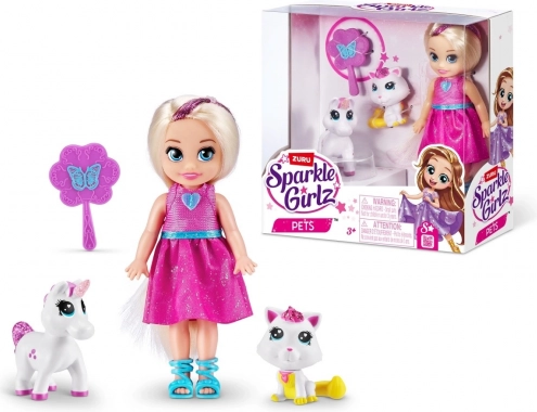 Urocza laleczka ZURU Sparkle Girlz z domowymi pupilami zapewnia godziny kreatywnej i pełnej wyobraźni zabawy. W zestawie znajdziesz lalkę w błyszczącej sukience, słodkie zwierzątko (jednorożec, kucyk lub kociątko) oraz stylową szczotkę/lusterko do czesania i pielęgnacji włosów. Świetny prezent dla dzieci od 3 lat, które kochają baśniowe opowieści i urocze akcesoria.