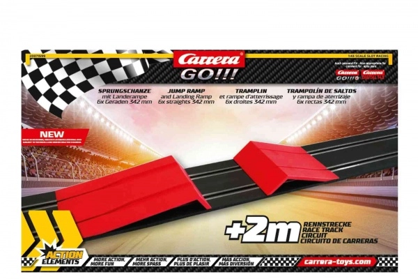 Rozszerz swój świat torów wyścigowych o skocznię do CARRERA GO!!! w skali 1:43. Zyskaj więcej akcji, dłuższy tor i bardziej emocjonujące wyścigi dzięki rampie startowej, rampie do lądowania oraz 6 prostym odcinkom o długości 342 mm – łącznie aż +2 metry trasy. Kompatybilne również z CARRERA DIGITAL 143.