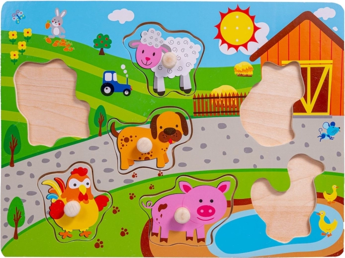 - Drewniane puzzle – uchwyty z obrazkami zwierząt z wiejskiej zagrody, farmy – kura, kot, pies, owca, kaczka itp.