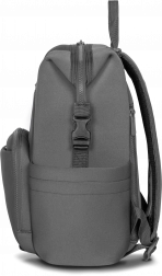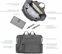 Przemyślany układ zapewnia szybki dostęp do wszystkich niezbędnych rzeczy dla dziecka i rodziców. Uniwersalne klamry umożliwiają łatwe przypięcie do wózka, a pomocnicze paski pozwalają zmniejszyć rozmiar tak, aby plecak zmieścił się także pod siedzeniem w samolocie.