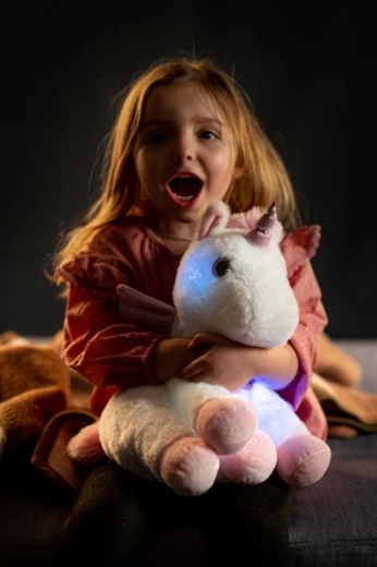 Spraw radość swoim dzieciom dzięki pluszowemu jednorożcowi, który stworzony jest do przytulania i zapewnia pocieszenie jako nocne światło. Jednorożec ma miękkie białe futro z różowymi akcentami i po naciśnięciu łapy odtwarza muzykę relaksacyjną. Zmienia kolory i świeci, co tworzy magiczną atmosferę.