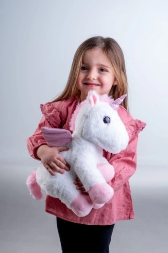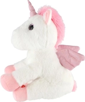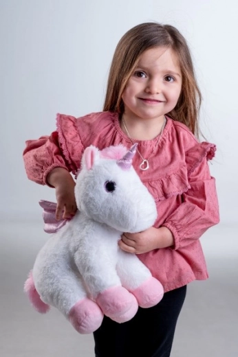 Pluszowy jednorożec z delikatnym białym futrem i różowymi detalami jest idealny do przytulania i pocieszenia.