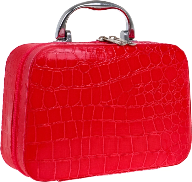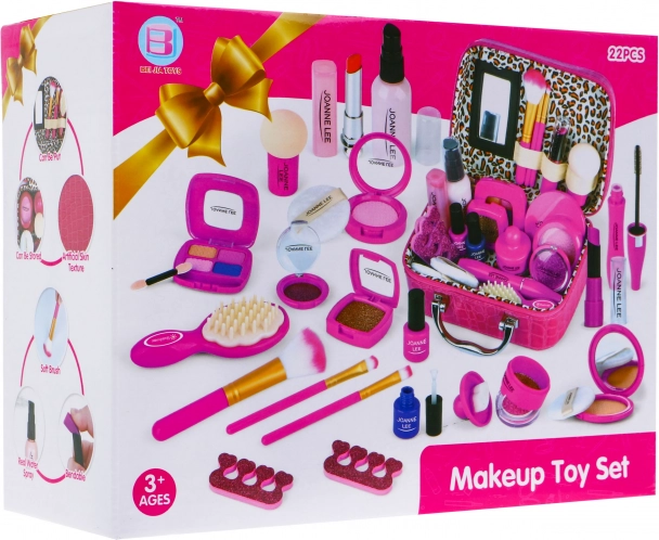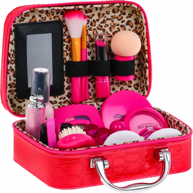 Zestaw z torebką wypełnioną po brzegi bezpiecznymi akcesoriami do makijażu to zabawka dla dzieci od 3 lat. Elegancki i duży kuferek wykonany jest z miękkiej ekoskóry. Ma wygodny uchwyt, cztery nóżki na spodzie oraz wewnętrzne lusterko. Zapinany na zamek. Cały zestaw składa się z 22 elementów, zawiera kosmetyki, takie jak cienie, brokaty, pomadki, lakier do paznokci, tusz do rzęs i wiele więcej. Kosmetyki są atrapami, ale wyglądają realistycznie, nie zużywają się, a dziecięca skóra jest bezpieczna. Zabawa kosmetykami rozwija kreatywne myślenie, ćwiczy wyobraźnię i wspiera koncentrację.