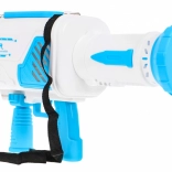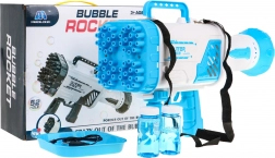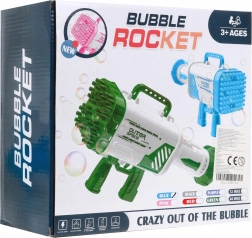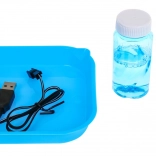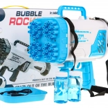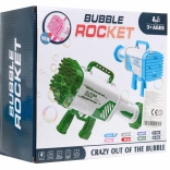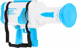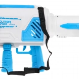 - Pistolet do baniek, 2× płyn do baniek, akumulator 3,7 V, naklejki, pasek, kabel USB, miseczka na płyn