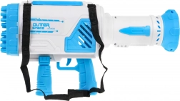 Ten dziecięcy pistolet do baniek zamieni każde popołudnie w kolorowe widowisko. Głowica z 52 dyszami oraz efektowne oświetlenie LED tworzą imponujący strumień baniek. Wystarczy wlać płyn do miseczki, zanurzyć głowicę i nacisnąć spust.